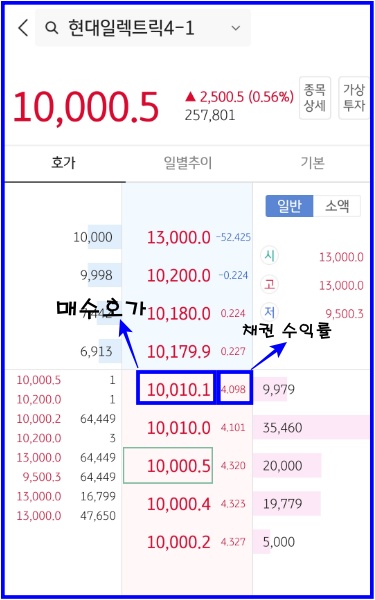 여기서 채권 수익률은 '매수하기' 버튼을 누르시고 호가창에 보면 오른쪽에 작은 글씨로 나와있습니다.